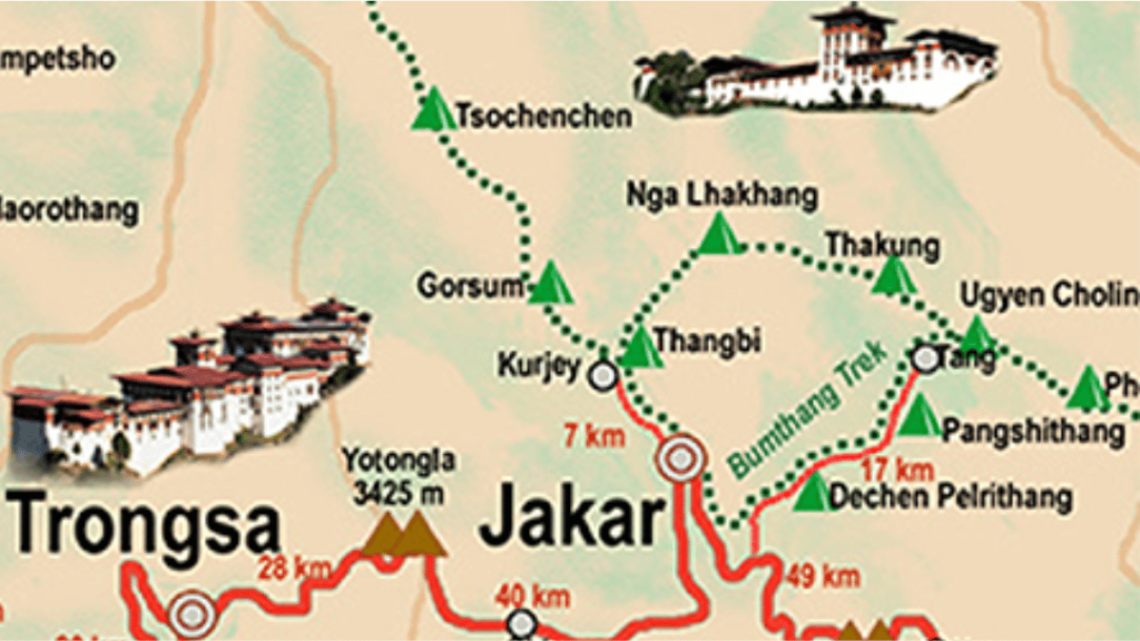 The route follows the Chamkhar Chu, a river known for trout and stops for lunch at Thangbi Lhakhang. From here the trek enters the Ngang Yul (Land of the Swan) at the centre of which lies the Ngang Lhakhang (Swan Temple). The valley was once populated by swans, and hence the name Ngang Yul.